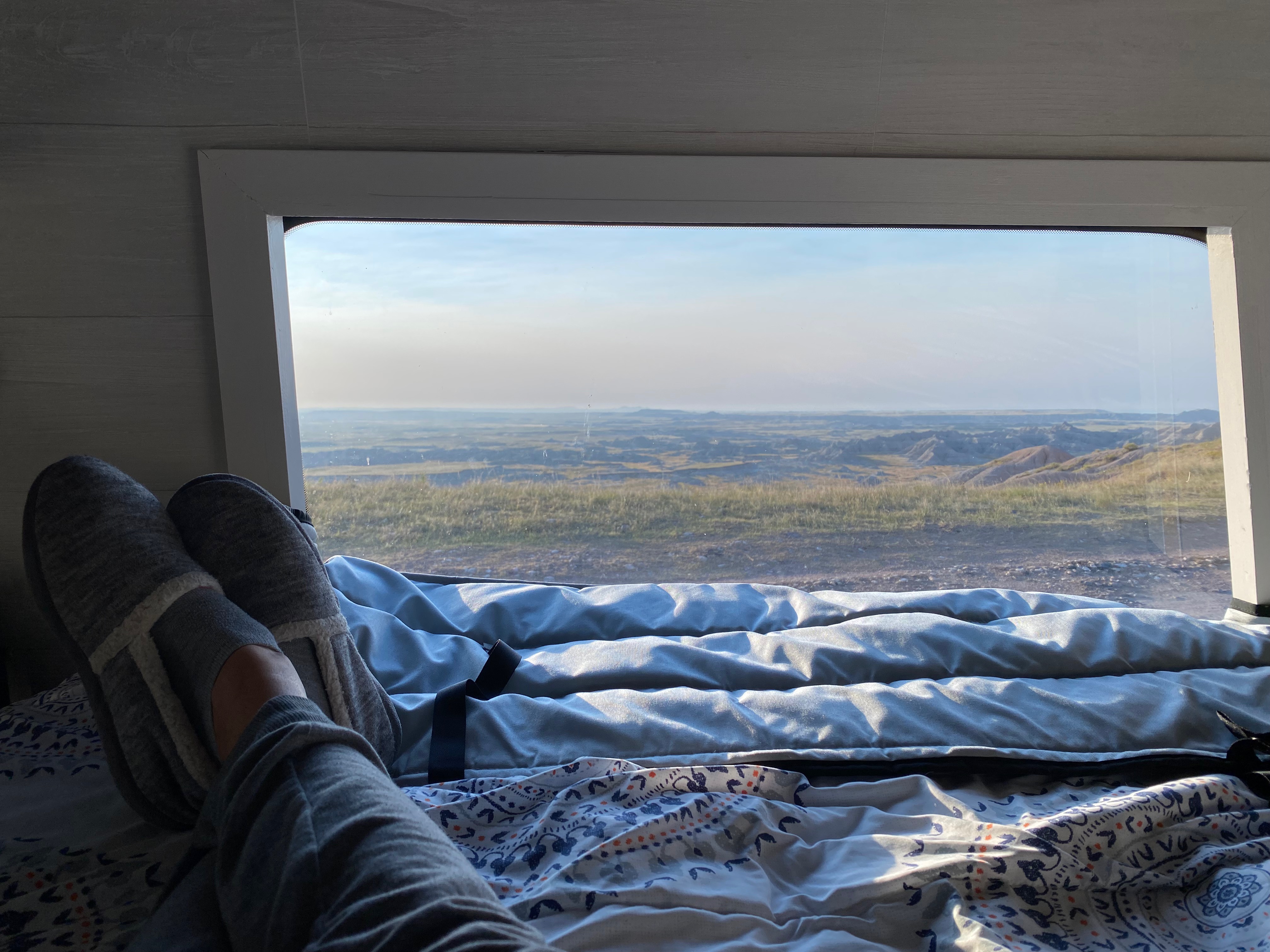 Our campsite for the night was a famous boondocking area featured in the movie Nomadland. It’s not an official campground, so people refer to it as different things (Nomad View, Wall Dispersed Camping Area, the Cliff, the Wall, etc). It’s a free camping area where you park along the edge of a cliff overlooking the Badlands. The drive up to the cliff was a narrow and bumpy dirt road, and since it was our first time driving our RWD van off the paved roads uphill to meet the edge of a cliff, we found it to be a little bit stressful!